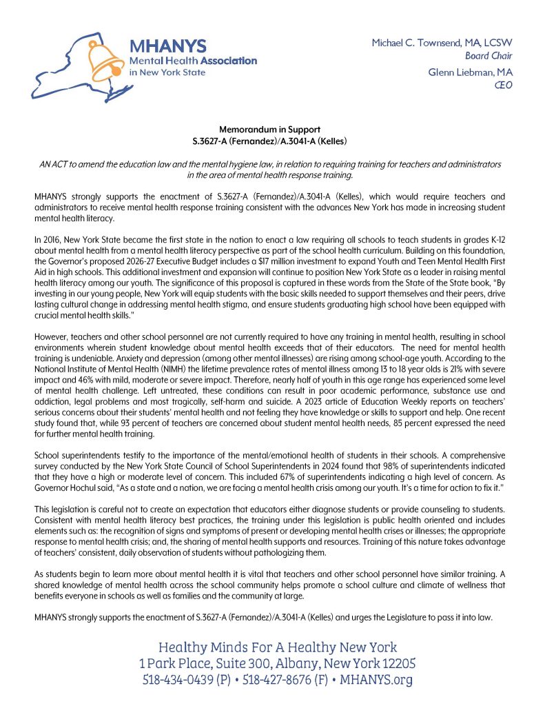 While there continues to be delays in budget negotiations, we are also working on our legislative agenda. Among our top priorities are a Teacher and Administrators Mental Health Training Bill. This legislation sponsored by Assemblymember Kelles and Senator Fernandez provides a basic training about mental health to teachers and administrators across New York State. This bill does not in any way provide any mandates for teachers around mental health. They have incredibly difficult jobs and layering in expectations around mental health care would be a ‘bridge too far.’